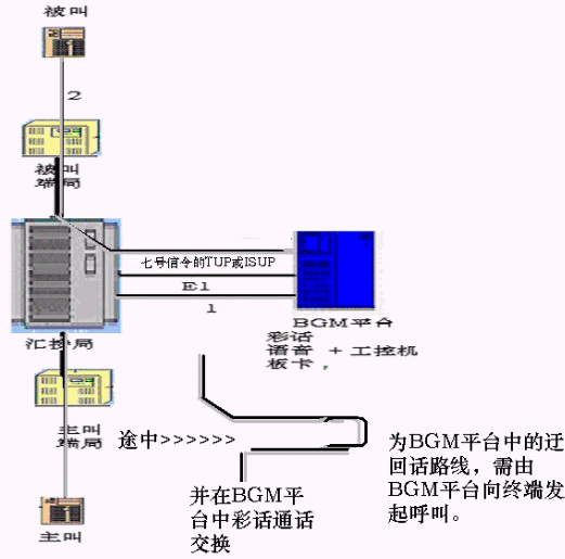 當呼叫進入?yún)R接局交換機并獲取呼叫的主被叫信息后,匯接局交換機對設(shè)置了彩話業(yè)務(wù)的用戶作呼叫轉(zhuǎn)移到BGM平臺,并同時通過ISUP信令把主叫、被叫號傳遞給BGM平臺,BGM平臺即時向被叫端局發(fā)起呼叫,當被叫方摘機,BGM平臺控制主叫與被叫接通,并根據(jù)被叫用戶保存的定制的彩話信息和業(yè)務(wù)邏輯對主被叫的通話進行相應(yīng)的背景語音播放操作,該語音僅作為背景音樂,不影響正常的雙方通話。當主被叫任意方掛機時,交換機將IVR單元和被叫的連接斷開,這樣就完成了一個完整的彩話服務(wù)。這種方案的技術(shù)優(yōu)勢是任何交換機都可實施,多么古老落后的運營設(shè)備都能實施,缺點是占用BGM平臺較大比例的語音板卡通道,語音板卡硬件的成本增加,因此需要選用高密度的信令語音一體化技術(shù)的語音板卡,可降低成本,并獲取較高的性能價格比。如下結(jié)構(gòu)示意圖: