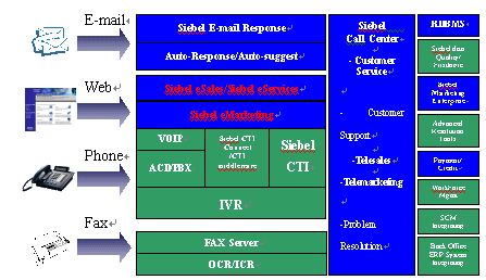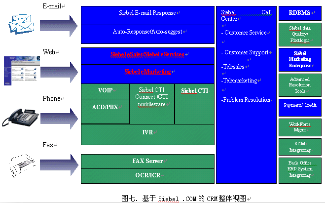 電子商務(wù)網(wǎng)站的運(yùn)作和企業(yè)網(wǎng)站的建設(shè),為其帶來了更多的市場(chǎng)商機(jī),嶄新的客戶接觸的機(jī)會(huì)?蛻粼谝幻腌妰(nèi)就能決定是選擇你還是別人,可以說未來網(wǎng)戰(zhàn)、傳統(tǒng)企業(yè)的競(jìng)爭(zhēng)就是客戶關(guān)系的競(jìng)爭(zhēng);網(wǎng)站要生存,企業(yè)要發(fā)展,關(guān)鍵要在發(fā)展客戶關(guān)系上下功夫。如何涉足CRM領(lǐng)域,如何盡快地利用CRM先進(jìn)的客戶關(guān)系管理理念,是擺在網(wǎng)站和傳統(tǒng)企業(yè)面前的一個(gè)棘手問題。以基于Siebel .COM應(yīng)用為涉足CRM的切入點(diǎn),使企業(yè)能夠更好地實(shí)施電子商務(wù)計(jì)劃,積極發(fā)展基于Web的客戶關(guān)系管理,最終使網(wǎng)站和企業(yè)真正成為接觸客戶、了解客戶、服務(wù)于客戶的商務(wù)平臺(tái),繼而不斷向完整的企業(yè)級(jí)CRM目標(biāo)邁進(jìn)。圖七展示出完整的基于Siebel .COM的CRM視圖。