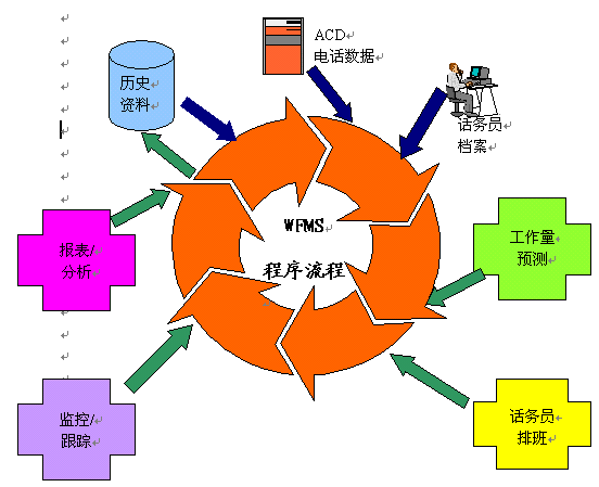 如上面所描述的WFMS流程,最初開始于歷史的電話信息、目前的ACD數(shù)據(jù)和服務(wù)代表的簡介。從這些綜合的信息,做出對工作量的預(yù)測,從而從本質(zhì)上決定了配備給呼叫中心的服務(wù)代表數(shù)量。了解了服務(wù)代表的需求數(shù)量,一個適用于任何時間段的工作時間表就可以產(chǎn)生了,包括每天的,每周的,每月的;谶@一點(diǎn),主管人就可以監(jiān)控服務(wù)代表的行為,追蹤來電,并分析不同種類的來電分組,做出應(yīng)對假定情景的方案,從而產(chǎn)生各種各樣的報(bào)告和圖表。