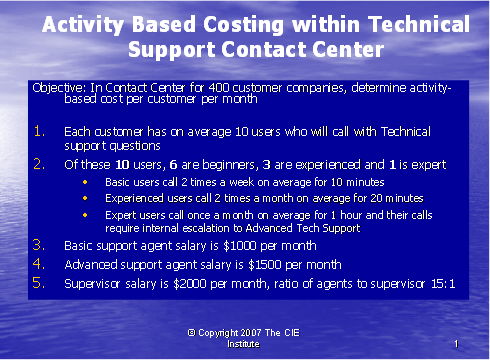 呼叫中心業(yè)務(wù)包括大量單獨(dú)的行動(dòng) — 行動(dòng)成本法(ABC)使我們跟蹤那些行動(dòng)以至于更清楚地了解支持一個(gè)客戶(hù)的所需事項(xiàng)。傳統(tǒng)上,呼叫中心成本是根據(jù)投入來(lái)衡量的:人數(shù),設(shè)備量,設(shè)施的規(guī)模。為了了解服務(wù)一個(gè)客戶(hù)所花費(fèi)的成本量,呼叫中心的主管必須確定這些行動(dòng)如何與該客戶(hù)相聯(lián)系的。只有做到這一點(diǎn),行業(yè)才能知道來(lái)自該客戶(hù)的收入是否超出為其提供服務(wù)所產(chǎn)生的成本。如果服務(wù)的成本大于收入,那么這個(gè)客戶(hù)對(duì)于行業(yè)來(lái)說(shuō)是無(wú)利可圖的,所以確定哪些客戶(hù)有利可圖和哪些客戶(hù)無(wú)利可圖是很重要的,這樣,行業(yè)才可以根據(jù)客戶(hù)定價(jià)和客戶(hù)服務(wù)策略有利地進(jìn)行管理。