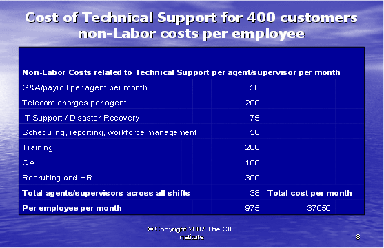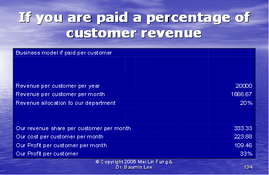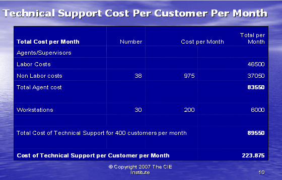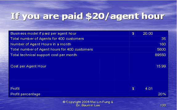 根據(jù)圖表12,我們可以算出第二種方式的利潤(rùn)百分比。如果我們假設(shè)每個(gè)客戶(hù)每年的收入是20,000美元,其中分配給呼叫中心部門(mén)的收入是20%。我們每個(gè)客戶(hù)每月的收入是333.33美元,每個(gè)客戶(hù)月的成本是223.88美元(參見(jiàn)圖表10)。這導(dǎo)致我們來(lái)自每個(gè)客戶(hù)每月的利潤(rùn)是109.46美元——這將產(chǎn)生33%的利潤(rùn)率。