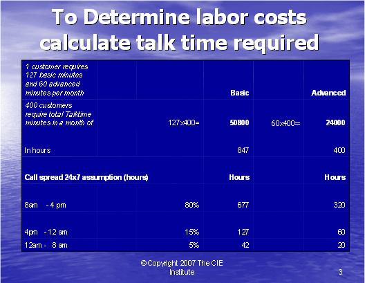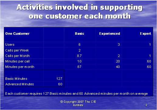 圖表2說(shuō)明了我們?nèi)绾问褂眠@些數(shù)字去計(jì)算基礎(chǔ)和高級(jí)技術(shù)支持需要為每個(gè)客戶(hù)每月所花的通話(huà)時(shí)長(zhǎng)。由于初級(jí)和有經(jīng)驗(yàn)的客戶(hù)使用者可以由基礎(chǔ)技術(shù)座席支持,所以基礎(chǔ)技術(shù)支持座席每月所接電話(huà)為87+40=127分鐘,高級(jí)技術(shù)支持座席每月所接電話(huà)為60分鐘。