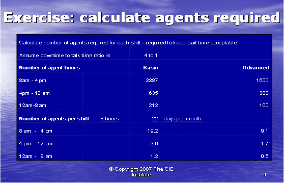 我們現(xiàn)在可以轉(zhuǎn)向下一階段的運(yùn)算,這一運(yùn)算決定我們需要多少座席去支持400個(gè)客戶(hù)。由于技術(shù)支持呼叫中心一天24小時(shí),一周7天進(jìn)行運(yùn)營(yíng),以及座席必須三班倒工作,使問(wèn)題更為復(fù)雜。通過(guò)測(cè)量一天當(dāng)中的話(huà)務(wù)量,我們發(fā)現(xiàn)80%的電話(huà)聚集在上午八點(diǎn)到下午四點(diǎn)的時(shí)間段,15%的電話(huà)聚集在下午四點(diǎn)到午夜的時(shí)間段,還有5%則在午夜到上午八點(diǎn)的時(shí)間段。因此,現(xiàn)在我們用該信息去計(jì)算每個(gè)排班中所需要的通話(huà)時(shí)長(zhǎng)。表3表明了根據(jù)基礎(chǔ)和高級(jí)支持需要而為我們計(jì)算出的小時(shí)數(shù)。