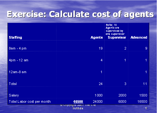 我們下一步就是計(jì)算出主管的成本。每次排班至少需要一個(gè)主管,如果這一排班的座席數(shù)要少一些,主管則也應(yīng)該能夠處理一些技術(shù)支持的電話(huà)。在這個(gè)例子中,我們將假設(shè)主管擁有高級(jí)支持座席的技術(shù)技巧。在圖表5中,你將看到我們使用了圖表4所得出的座席數(shù),并假設(shè)這是每次排班話(huà)務(wù)量中所需的各種類(lèi)型員工的數(shù)量:基礎(chǔ),高級(jí)和主管。我們同時(shí)用圖表1中的薪資去計(jì)算座席和主管支持400個(gè)客戶(hù)的總成本。通過(guò)把每種座席單獨(dú)的成本相加(24個(gè)基礎(chǔ)座席,11個(gè)高級(jí)座席和3個(gè)主管),得出每月的人工成本為46,500美元。