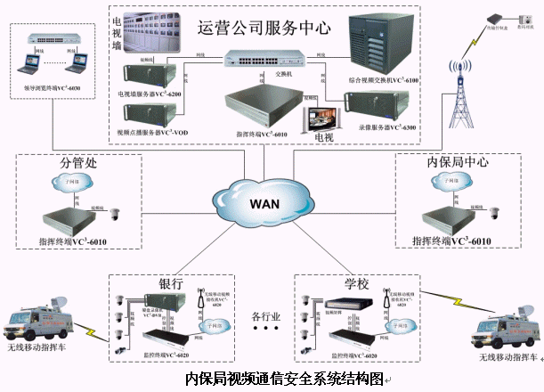 針對以上情況,北京華緯訊電信技術有限公司基于最新推出的VC3-6000綜合視頻通信平臺提出了針對性的"城市安保聯(lián)動視頻通信平臺"解決方案。該平臺整合多種資源,實現了視頻指揮調度、遠程視頻監(jiān)控、視頻會議、視頻點播、無線移動視頻接入、高清晰圖片傳輸和環(huán)境監(jiān)測等功能。平臺組成如下圖: