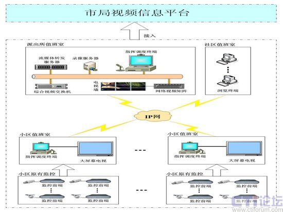 視頻聯(lián)防聯(lián)動系統(tǒng)由派出所指揮調度室、社區(qū)值班室、小區(qū)值班室和小區(qū)前端監(jiān)控等部分組成,其中小區(qū)部署指揮調度終端,可負責本小區(qū)即周邊的監(jiān)控管理;社區(qū)值班室部署視頻瀏覽端,可以實時監(jiān)看管轄區(qū)域的視頻圖像;派出所部署綜合視頻交換機、流媒體轉發(fā)服務器、網(wǎng)絡視頻矩陣、錄像服務器、指揮調度終端,可以監(jiān)控管理管轄區(qū)內所有視頻圖像,并可接入到市局視頻信息平臺,實現(xiàn)與3111工程的接入。派出所、社區(qū)、小區(qū)多方可實現(xiàn)社區(qū)治安視頻聯(lián)防聯(lián)動,系統(tǒng)結構圖如下所示: