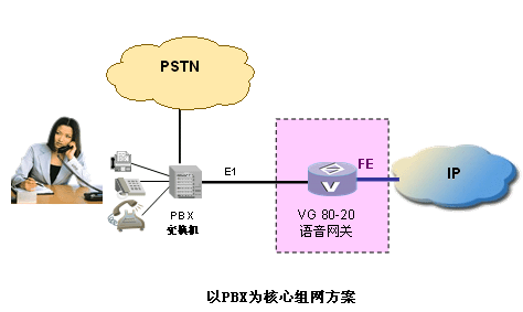 將VG 80-20連接在在PBX和PSTN網(wǎng)之間,使用VG 80-20的一個E1語音接口連接PSTN,另一個E1語音接口連接PBX。由語音網(wǎng)關(guān)根據(jù)撥號策略決定使用PSTN呼叫還是VoIP呼叫,實現(xiàn)自動選路功能。這樣可以在撥號方式和電話號碼也不需要作任何改變的情況下,實現(xiàn)長途旁路IP電話功能。