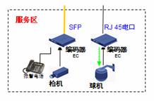服務(wù)區(qū):配置球機(jī)直接接入編碼器,編碼器通過(guò)電口或SFP光纖接入交換機(jī)中,可以選配IP電話方便報(bào)警及和中心的互通。