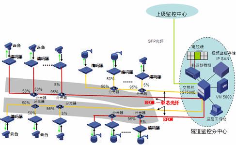 隧道:隧道監(jiān)控分中心可以利用EPON方案進(jìn)行部署,只需一芯光纖即可進(jìn)行連接相應(yīng)的監(jiān)控點(diǎn),單芯光纖最大可以級(jí)聯(lián)32級(jí)。由于隧道一般100米左右部署監(jiān)控點(diǎn),可以節(jié)約大量光纖,降低維護(hù)量。
