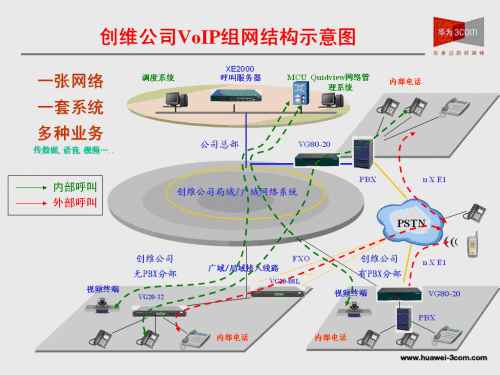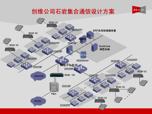 整個解決方案大量使用了華為3Com公司自主研發(fā)的XE2000、VG80-20、VG20-32、VG20-16、VG21-08等一系列VOIP系統(tǒng),整個石巖基地語音點(diǎn)數(shù)覆蓋1500點(diǎn)以上,未來發(fā)展可以擴(kuò)展到2500點(diǎn)。