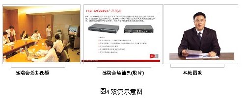 雙視頻流傳輸是指同時(shí)傳輸兩路動(dòng)態(tài)視頻到各分會(huì)場:雙流是指分會(huì)場能夠?qū)⒈緯?huì)場的兩路視頻同時(shí)傳輸?shù)組CU上,MCU 能夠?qū)陕芬曨l同時(shí)傳輸?shù)礁鞣謺?huì)場。ME5000與MG6060配合可以將終端第二路視頻傳輸?shù)狡渌麜?huì)場,適用于在開會(huì)的同時(shí),對文件、圖片講解,使會(huì)議更加生動(dòng),內(nèi)容更加豐富。