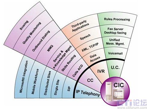 CIC平臺是一套符合呼叫中心營運所需,且有其營運所需模塊的All In One設(shè)備,如數(shù)字交換機、PABX、CTI、IVR、ACD、 Screen Pop、數(shù)據(jù)庫整合、網(wǎng)站整合服務(wù)(Web Call Back、Web Chat、VON、E-mail)、傳真服務(wù)器、傳真自動回復(fù)、Dialer、Scripter、在線錄音...等所有功能,采用CIC平臺的系統(tǒng)比基于傳統(tǒng)PBX的系統(tǒng)更加易于維護(hù)。 CIC為企業(yè)體帶來一個功能齊備,技術(shù)人員及值機人員可以自己完全掌握的Call Center系統(tǒng),并且也是一個最上算投資報酬率ROI(Return Of Investment)的解決方案。