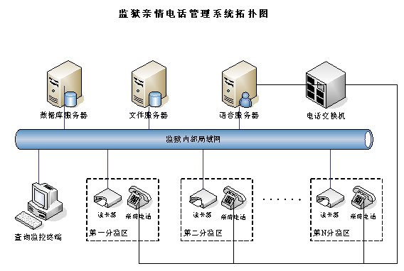 親情電話管理系統(tǒng)在系統(tǒng)設(shè)計(jì)中充分考慮監(jiān)獄的需求與特點(diǎn),不但包含了一般親情電話錄音所需的全部功能,而且還融合了獄政管理的功能,整個(gè)系統(tǒng)采用集中式方式,在中心機(jī)房部署一套親情電話錄音服務(wù)器,各個(gè)監(jiān)區(qū)監(jiān)控系統(tǒng)利用監(jiān)獄內(nèi)部的局域網(wǎng)聯(lián)結(jié)成一個(gè)整體,形成一個(gè)能監(jiān)控監(jiān)獄親情電話的全網(wǎng)。這樣即可以在每個(gè)監(jiān)區(qū)監(jiān)聽,也可以在監(jiān)獄內(nèi)部網(wǎng)的任何地方對(duì)親情電話進(jìn)行全程監(jiān)視。該系統(tǒng)能夠完全滿足目前監(jiān)獄的需求,產(chǎn)品性價(jià)比遠(yuǎn)遠(yuǎn)高于市場上其他同類產(chǎn)品。