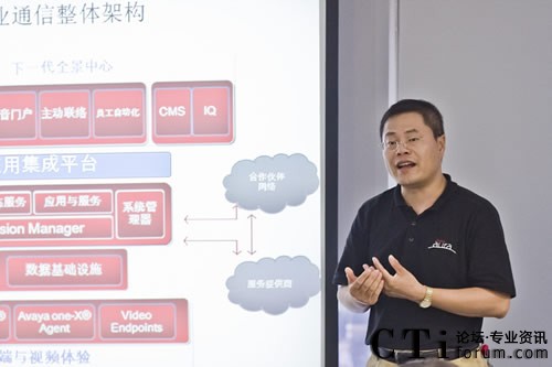 上圖為:Avaya中國區(qū)副總裁李農(nóng)講解Avaya Aura 聯(lián)絡中心6.2系統(tǒng)架件