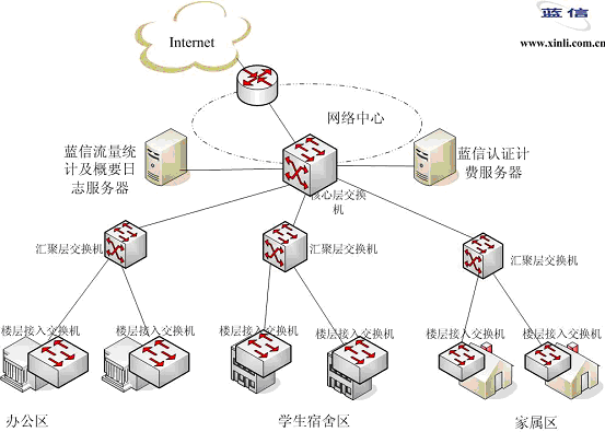 在網(wǎng)絡(luò)中心機房部署“藍信認證計費系統(tǒng)”,藍信認證計費系統(tǒng)除支持標準的RADIUS協(xié)議外,還支持領(lǐng)先的802.1x協(xié)議,通過與各接入層交換機的配合,實現(xiàn)了認證管理功能。通過綁定帳號、IP、MAC地址等15元素,真正保證只有合法用戶才能通過認證;對用戶進行分級權(quán)限管理,可按信用度等級對用戶進行劃分,方便了用戶的管理。此外,在網(wǎng)絡(luò)出口處部署藍信流量統(tǒng)計工具,通過與藍信認證計費系統(tǒng)的配合,實現(xiàn)對用戶按流量來計費,可以把用戶訪問流量按校內(nèi)校外、國內(nèi)國際來區(qū)別對待,并設(shè)置不同的費率。同時,還部署了藍信概要日志系統(tǒng),有效記錄了用戶的上網(wǎng)信息,并提供人性化的web客戶端,方便管理者進行事后查詢,有效的控制了網(wǎng)絡(luò)的安全性。