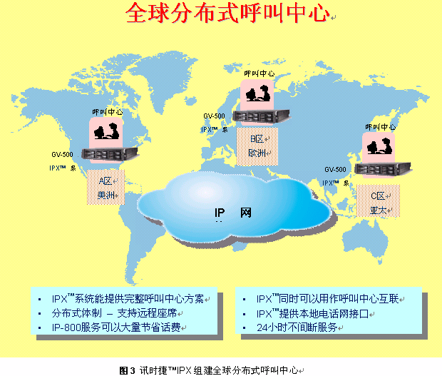 將客服人員辦公地點(diǎn)設(shè)立在人力成本相對(duì)低廉的地方,在其它需要有客服的地方架設(shè)帶FXO的語音網(wǎng)關(guān),將該網(wǎng)關(guān)注冊(cè)到訊時(shí)捷 IPX上,將當(dāng)?shù)乜头娫捵詣?dòng)轉(zhuǎn)入到公司總部的訊時(shí)捷