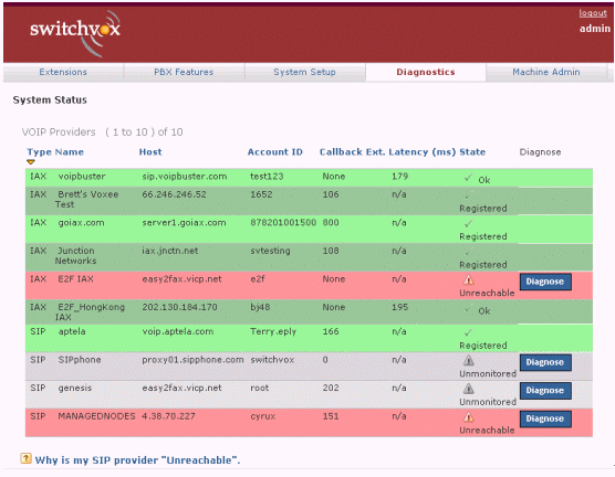 圖5中綠色表示正常,紅色表示出現(xiàn)問題,白色表示從沒有接通過。如果你按診斷(Diagnose),系統(tǒng)便會(huì)通過自動(dòng)測試,告訴你問題出自哪一部分。如果需要對(duì)每一個(gè)的詳細(xì)解析,可以按底部Why這個(gè)標(biāo)題,找尋答案。類似的終端、話機(jī)等配置、硬件診斷等,也有非常明了的界面與解決問題的辦法。