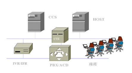 智能化網(wǎng)絡(Intelligent Network)、排隊機(ACD)、計算機語音集成(CTI)、自動語音/傳真響應設(shè)備(IVR/IFR)、業(yè)務系統(tǒng)主機HOST、座席(Agent)、信息板(Wall