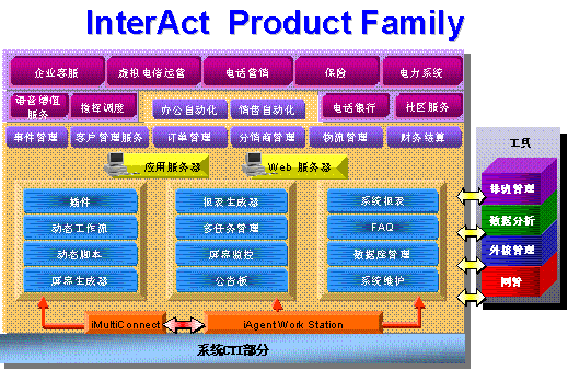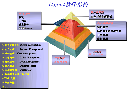 iAgent3.0從軟件內部的結構體系上加以突破,統(tǒng)一開放的應用平臺上組合功能強大的二次開發(fā)工具,并在此基礎上加以針對行業(yè)而特別設計的功能模板。更好的適應了企業(yè)處理流程的多樣化和需求的復雜化,并為企業(yè)高速的業(yè)務增長和功能需求增長帶來極大的拓展空間。軟件結構如下圖所示: