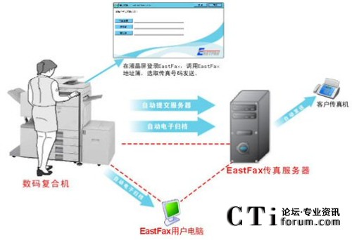 EastFax傳真系統(tǒng)在電子傳真與復(fù)合機之間找到了最佳的結(jié)合點,充分利用復(fù)合機的高速掃描功能,實現(xiàn)在復(fù)合機的液晶面板上操作,將紙張內(nèi)容掃描并直接提交到傳真服務(wù)器發(fā)送,在國內(nèi)第一個實現(xiàn)了傳真服務(wù)器與復(fù)合機的無縫集成,解決了發(fā)送紙質(zhì)傳真文件的最大瓶頸。