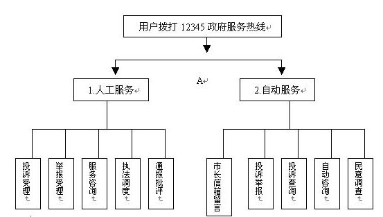 當(dāng)用戶撥通"12345"電話并選擇自動(dòng)服務(wù)時(shí),聲訊臺(tái)自動(dòng)播放引導(dǎo)語(yǔ)"選擇市長(zhǎng)信箱留言請(qǐng)按1,自動(dòng)投訴舉報(bào)請(qǐng)按2,投訴查詢請(qǐng)按3,服務(wù)咨詢請(qǐng)按4,民意調(diào)查請(qǐng)按5。