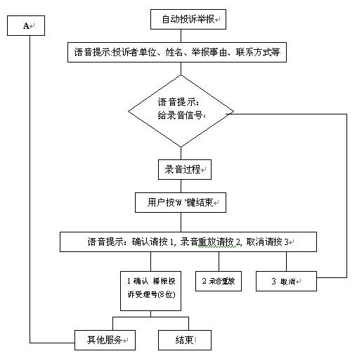 群眾通過(guò)自動(dòng)臺(tái)按照語(yǔ)音提示進(jìn)行投訴、舉報(bào)選擇錄音。自動(dòng)投訴舉報(bào)錄音流程如下: