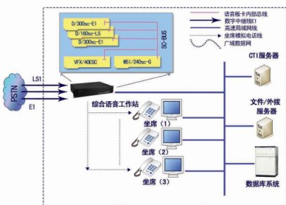 一體化板卡方案是用勤針對企業(yè)級用戶而專門量身定制的呼叫中心產(chǎn)品,主要由工業(yè)用控制計(jì)算機(jī)(工控機(jī))加插語音板卡以及板卡的驅(qū)動控制軟件實(shí)現(xiàn)電話語音交換機(jī)能力。綜合語音工作站相當(dāng)于一臺小的交換機(jī),內(nèi)置 CTI 控制、 ACD 排隊(duì)、 IVR 、錄音等功能。組網(wǎng)方式: