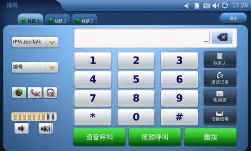 7寸大屏搭配寬大的數(shù)字虛擬鍵盤,讓你的撥號(hào)準(zhǔn)確無誤。同時(shí)界面的所顯示的通話功能諸如查找聯(lián)系人、查找通話記錄、發(fā)送短消息或者快速進(jìn)入語音信箱等功能也清晰明了。可以發(fā)現(xiàn)的是,用戶在輸完號(hào)碼之后可自主選擇采用語音呼叫還是視頻呼叫。另外,同潮流網(wǎng)絡(luò)之前的一款視頻電話GXV3140一樣的是,GXV3175也在出廠自帶了一個(gè)IPVideoTalk賬號(hào)。該賬號(hào)是出廠時(shí)就已配置好的,每一臺(tái)電話配備一個(gè)號(hào)碼并顯示在桌面上。也就是說,用戶在拿到GXV3175并聯(lián)網(wǎng)之后即可使用該賬號(hào)撥打免費(fèi)的視頻電話了。這可是很多廠商所沒有的特殊功能。下面我們就使用隨機(jī)附送的IPVideoTalk賬號(hào)來?yè)艽蛞曨l電話。