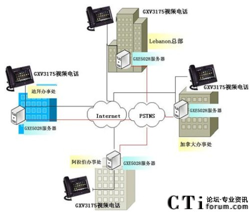在Tabbara公司的全球四個辦事處分別安裝潮流網(wǎng)絡(luò)的GXE5028 IPPBX服務(wù)器或者其他的SIP Sever通信平臺,GXE5028 IP PBX支持語音信箱,郵件和其他通信功能應(yīng)用,每一臺GXE5028最大限度地支持分布全球辦事處的所有通信賬號同時連接到同一網(wǎng)絡(luò)中,終端連接IP電話,IP視頻電話以及IP視頻監(jiān)控攝像機作為語音/數(shù)據(jù)的輸入輸出,當然IP PBX也可通過網(wǎng)絡(luò)連接到VoIP服務(wù)器中間位置的SIP中繼。潮流網(wǎng)絡(luò)的GXV3175多媒體觸摸屏視頻電話,支持標準的SIP協(xié)議,先進的H.264/H.263/H.263+視頻壓縮標準,寬大的7寸彩色觸摸顯示屏實現(xiàn)溝通面對面的零距離交流,以及撥打網(wǎng)絡(luò)攝像機觀看監(jiān)控現(xiàn)場。潮流網(wǎng)絡(luò)的GXV3662_HD高清防暴半球IP攝像機和GXV3651_HD IP攝像機,分別安裝在辦事處關(guān)鍵位置,365天,每周24*7個小時進行實時監(jiān)控,作為企業(yè)財產(chǎn)和人員安全的保障。方案中,各分支機構(gòu)之間通話免費,撥打分支機構(gòu)所在地其他電話按市話費算,出差人員使用IP電話與公司內(nèi)部通話免費。