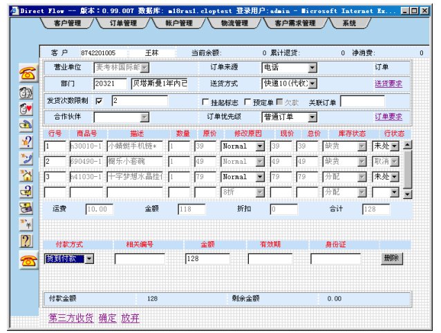 如果客戶訂單采用匯款支付方式,當(dāng)財(cái)務(wù)部門(mén)收到到款通知,并輸入CRM系統(tǒng),系統(tǒng)會(huì)向發(fā)貨部門(mén)下達(dá)發(fā)貨工單。如果客戶訂單采用一卡通支付方式,系統(tǒng)確認(rèn)支付無(wú)誤就立即向發(fā)貨部門(mén)下達(dá)發(fā)貨工單,整個(gè)過(guò)程全部自動(dòng)化。