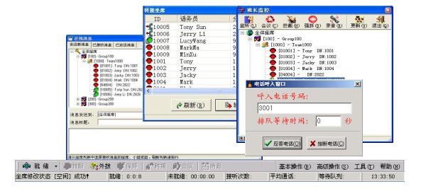 所有線路、座席狀態(tài)、操作時(shí)長(zhǎng)的動(dòng)態(tài)監(jiān)視,動(dòng)態(tài)監(jiān)視呼叫隊(duì)列長(zhǎng)度,并能實(shí)現(xiàn)監(jiān)聽(tīng)、強(qiáng)插、強(qiáng)拆、強(qiáng)制注銷控制功能。