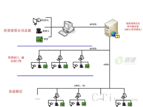有容商貿(mào)大規(guī)模網(wǎng)絡(luò)遠(yuǎn)程會(huì)議和培訓(xùn)系統(tǒng)由服務(wù)器端和客戶端組成,服務(wù)器端軟件部署在公司中心機(jī)房,中心機(jī)房配置1臺(tái)單獨(dú)服務(wù)器,支持400個(gè)客戶端同時(shí)在線,負(fù)責(zé)所有會(huì)議和培訓(xùn)的召集、音視頻交互、加密等工作,有容商貿(mào)各部門、轄下各連鎖店通過(guò)WEB方式(包括ADSL、3G無(wú)線等多種網(wǎng)絡(luò))即可實(shí)現(xiàn)客戶端軟件的自動(dòng)安裝與升級(jí),配備簡(jiǎn)單的攝像頭和話筒之后就可以實(shí)現(xiàn)有容商貿(mào)以及連鎖店的大規(guī)模工作會(huì)議和高清音視頻網(wǎng)絡(luò)培訓(xùn)。網(wǎng)絡(luò)拓?fù)鋱D如下: