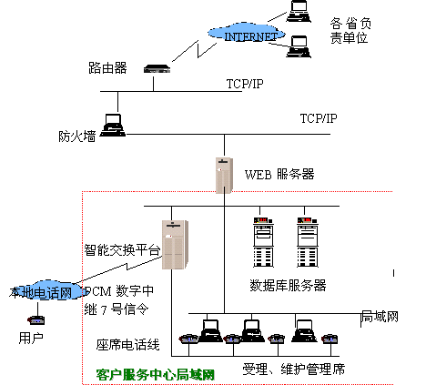 數(shù)據(jù)通信局的客戶遍布全國各地,建立一個(gè)覆蓋全國的客戶服務(wù)網(wǎng)絡(luò)勢(shì)在必行,因此我公司為之構(gòu)建了數(shù)據(jù)通信局客戶服務(wù)系統(tǒng),全國各地的各個(gè)客服中心的數(shù)據(jù)可以通過專線連接,語音也可以通過VOIP用數(shù)字專線連接,以降低長(zhǎng)話費(fèi)用。該系統(tǒng)的投入使用,不但滿足了數(shù)據(jù)局為全國各地客戶服務(wù)的需要,而且可以收集客戶信息,不但降低了辦公費(fèi)用,而且有利于擴(kuò)大市場(chǎng)分額。數(shù)據(jù)通信客戶服務(wù)中心的主要目的是解決對(duì)全國大客戶的業(yè)務(wù)咨詢與申辦、障礙申告、投訴與建議的集中管理以及處理控制,系統(tǒng)采用800號(hào)接入,以一個(gè)小型的交換設(shè)備為座席電話分配點(diǎn),客戶撥入的電話,經(jīng)小型交換設(shè)備分配到空閑的座席上。