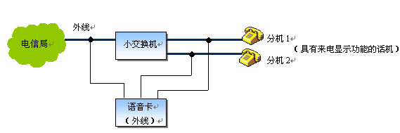 說明:將語音卡的外線通道并接在小交換機的全部內(nèi)外線端口上,在軟件的控制下,不僅可以將外線來電號碼轉(zhuǎn)發(fā)至分機,并且還可以在內(nèi)線通話時,看到通話對方的號碼,非常實用。當然,如果直接采用語音卡(外線+座席)來構(gòu)成小交換機,則系統(tǒng)更為簡潔,成本也大為降低。