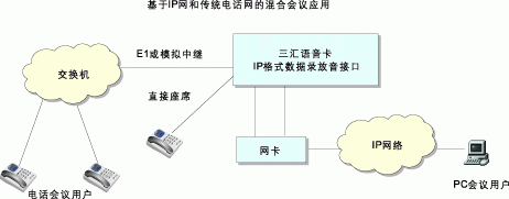交互式電話(huà)會(huì)議與傳統(tǒng)的電話(huà)會(huì)議的區(qū)別就在于開(kāi)會(huì)時(shí)不需要由會(huì)議主持人控制由某人發(fā)言,而是所有與會(huì)者可以自由發(fā)言,就如同坐在同一間會(huì)議室中一樣。三匯公司所有型號(hào)的基于DSP技術(shù)的語(yǔ)音卡,包括數(shù)字卡和模擬卡,均內(nèi)置了對(duì)交互式電話(huà)會(huì)議的支持,只要使用語(yǔ)音卡,無(wú)需額外的會(huì)議卡,就可以構(gòu)成具有完善功能的交互式電話(huà)會(huì)議系統(tǒng)。三匯公司還采用了獨(dú)創(chuàng)的分布式電話(huà)會(huì)議實(shí)現(xiàn)技術(shù),電話(huà)會(huì)議的關(guān)鍵資源----混音器分布在每一個(gè)通道中。因此語(yǔ)音卡對(duì)會(huì)議系統(tǒng)的支持具有極大的靈活性,既可以召開(kāi)大量的三方會(huì)議,也可召開(kāi)所有通道同時(shí)參加的大型會(huì)議,無(wú)論是會(huì)議的數(shù)量還是參加會(huì)議的人數(shù)均只受系統(tǒng)總通道數(shù)的限制。三匯語(yǔ)音卡還支持IP會(huì)議和傳統(tǒng)電話(huà)會(huì)議的混合應(yīng)用。