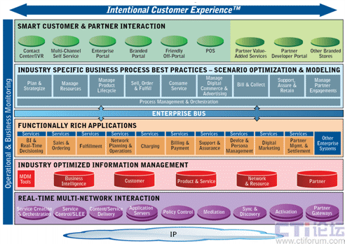 其次,CES改變了現(xiàn)有的業(yè)務(wù)應(yīng)用層將功能和流程融合在一起的模式,對(duì)流程和功能進(jìn)行了分離。實(shí)際上,應(yīng)用功能和流程結(jié)合得越緊密,系統(tǒng)的適應(yīng)性就會(huì)越差,對(duì)新業(yè)務(wù)和新產(chǎn)品的響應(yīng)時(shí)間就越長(zhǎng),CES將業(yè)務(wù)應(yīng)用層分為流程層和應(yīng)用功能層,流程和功能的分離極大的提高了系統(tǒng)靈活性,降低了系統(tǒng)集成的復(fù)雜程度和成本開銷,滿足了新業(yè)務(wù)和新產(chǎn)品快速上市的要求。在流程層,運(yùn)營(yíng)商不僅可以選擇采用Amdocs在25年服務(wù)經(jīng)驗(yàn)的基礎(chǔ)上總結(jié)的業(yè)界最佳實(shí)踐的業(yè)務(wù)流程,也可以選擇采用企業(yè)現(xiàn)有的業(yè)務(wù)流程;在應(yīng)用功能層,Amdocs全系列軟件產(chǎn)品將更加模塊化,運(yùn)營(yíng)商可以選擇Amdocs全系列軟件產(chǎn)品,也可以選擇其中的個(gè)別或部分產(chǎn)品,這種高度模塊化的產(chǎn)品將以更快的速度集成到運(yùn)營(yíng)商已有的IT框架中。