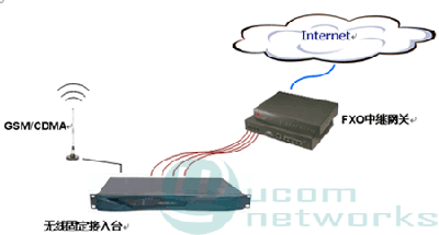 本方案采用FXO中繼語音網(wǎng)關(guān)接入互聯(lián)網(wǎng),由當(dāng)?shù)仄胀M電話線路落地對接網(wǎng)關(guān)FXO口,采用電話卡綁定網(wǎng)關(guān)預(yù)付費計費實現(xiàn)運營。落地線路接入可以使用本地固定PSTN線路,也可以轉(zhuǎn)制無線電話,采用固定臺接入,2種拓撲圖如下所示。