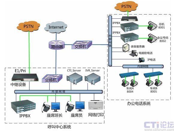 化。在總部核心機房將電話外線中繼接口與中繼網關設備連接,并通過內部網絡對接到IPPBX,分別應用于辦公電話系統和公司呼叫中心系統。設備用于公司辦公電話和公司會議系統,可最大支持到30方會議,或多個小型獨立會議系統。各個不同的車間可以采用電話線之間接入分機,或采用傲威AVG800的網關通過網絡接入,并注冊到IPPBX系統實現內網網絡分機。對將來的分公司的辦公電話系統,將不再使用傳統的PBX設備,而是直接利用IPPBX系統,通過IP