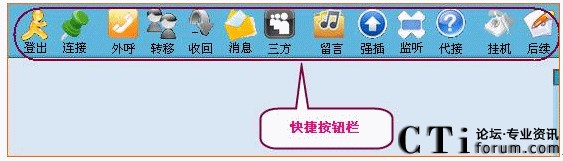 按鈕包括: 登出、 連接、 示忙、 示閑、 斷開、 外呼、 轉(zhuǎn)移、 收回、 消息、 三方、 留言、 強(qiáng)插、 監(jiān)聽、 代接、 掛機(jī)、 后續(xù)。