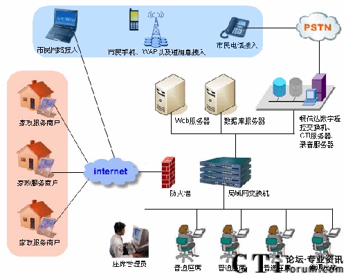 隨著國內(nèi)城市化地不斷加快,人口老齡化的加劇,人民群眾對家政服務(wù)需求也越來越旺盛,家政服務(wù)業(yè)的重要性也日益凸顯。為了規(guī)范家政服務(wù)市場、整合家政市場資源、培育家政服務(wù)示范性企業(yè),國家商務(wù)部、財務(wù)部于2009年4月下發(fā)了《關(guān)于推進(jìn)家政服務(wù)網(wǎng)絡(luò)體系建設(shè)的通知》的149號文件,啟動了家政服務(wù)網(wǎng)絡(luò)中心體系建設(shè)的項目,并提出了具體的規(guī)范和要求。以此為起點,為更好地服務(wù)社會滿足人民群眾日益增長的生活需求而努力。自文件下發(fā)以來,我公司就組織專門的項目組,對家政服務(wù)行業(yè)具體業(yè)務(wù)需求的調(diào)研以及開發(fā)工作。公司利用多年的開發(fā)經(jīng)驗,經(jīng)過幾個月的努力,終于在8月份完成了暢信達(dá)家政服務(wù)網(wǎng)絡(luò)中心的全套建設(shè)方案。與其它系統(tǒng)固化的功能設(shè)計不同,該方案可以靈活地定制業(yè)務(wù)模塊,方便各地的家政公司根據(jù)本市的情況和需求,確定適合自身的業(yè)務(wù)流程。系統(tǒng)業(yè)務(wù)模塊完整地覆蓋了家政服務(wù)的業(yè)務(wù)范圍與重點。并將家政服務(wù)的業(yè)務(wù)分為營業(yè)系統(tǒng)、賬務(wù)系統(tǒng)、后臺系統(tǒng)等部分,貫穿了市民從訴求提交、工單派發(fā)、工單處理、財務(wù)結(jié)算到回訪反饋的各個方面。系統(tǒng)還提供了完善的報表模塊準(zhǔn)確反映業(yè)務(wù)和系統(tǒng)運營狀況,有力地支持對平臺進(jìn)行運營管理工作。另外在方案設(shè)計上,除了滿足業(yè)務(wù)處理需要外,還充分考慮到系統(tǒng)的適應(yīng)性、穩(wěn)定性和處理的能力。首先為了滿足各地市對家政平臺的不同需求,公司專門推出了基于IBM服務(wù)器的和暢信達(dá)標(biāo)配服務(wù)器的兩種建設(shè)方案。暢信達(dá)標(biāo)配服務(wù)器方案可提供最低4模擬外線最多1條數(shù)字中繼(E1)接入,適用于初期規(guī)模較小且投資規(guī)模不大的客戶。而基于IBM服務(wù)器的方案,則主要是滿足業(yè)務(wù)量較大,同時對設(shè)備配置要求高的城市,以數(shù)字線接入為主。多種建設(shè)模式充分體現(xiàn)了方案的靈活性、可擴(kuò)展性的特征,有效地減少了運營風(fēng)險,提升了個性化定制化服務(wù)的水平。其次,根據(jù)家政市場需求預(yù)測以及已開通家政服務(wù)網(wǎng)絡(luò)中心城市的實際運營情況,一個中型城市,預(yù)計電話開通之后,話務(wù)量平均每天近3000個,這就要求系統(tǒng)不但有穩(wěn)定的性能而且要有強(qiáng)大的處理能力。我公司從系統(tǒng)平臺構(gòu)建、業(yè)務(wù)流程設(shè)計、設(shè)備性能、組網(wǎng)設(shè)計等方面著手,為系統(tǒng)提供了足以確保安全穩(wěn)定運行的支持。