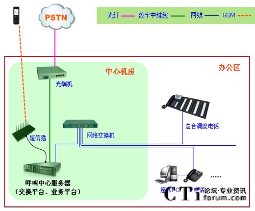 維佳元?jiǎng)?chuàng)呼叫中心系統(tǒng)采用暢信達(dá)通信呼叫中心交換平臺(tái)與業(yè)務(wù)平臺(tái),采用1路E1數(shù)字中繼線接入,對(duì)外公布一個(gè)400號(hào)碼與10多個(gè)辦公電話號(hào)碼,采用IP話機(jī)作為總臺(tái)調(diào)度電話、座席電話與辦公電話,系統(tǒng)架構(gòu)形式如下: