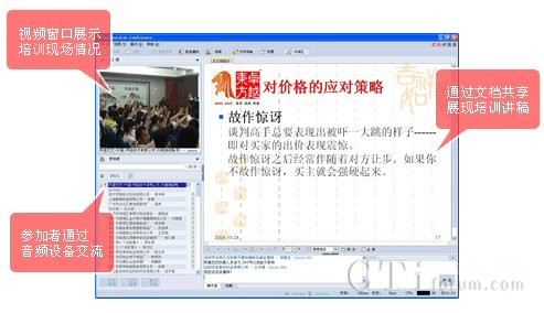 高清晰的視頻,可以讓網(wǎng)絡(luò)培訓(xùn)用戶感受培訓(xùn)現(xiàn)場(chǎng)氣氛。文檔共享和音頻可以讓用戶感受培訓(xùn)人員的聲情并茂。同時(shí)用戶可以在網(wǎng)絡(luò)培訓(xùn)系統(tǒng)的答疑區(qū)提出自己的問題,和培訓(xùn)人員進(jìn)行互動(dòng)。