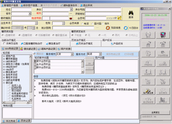 諾和關(guān)懷糖尿病服務(wù)中心的服務(wù)坐席可以實(shí)現(xiàn)患者信息的同步提示功能,當(dāng)電話被分配至坐席的同時,患者的資料信息也同步出現(xiàn)在PC終端上。同時坐席終端可以自動記錄對方的電話號碼,也可以實(shí)時顯示正在排隊等待的人數(shù),提示服務(wù)人員加快業(yè)務(wù)受理速度。