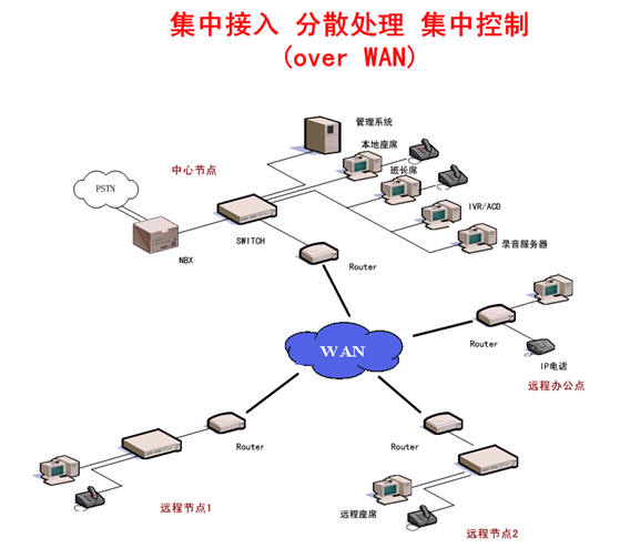 VoIP 技術(shù)與呼叫中心的結(jié)合,不僅僅讓用戶享受到Internet帶來的大量話費(fèi)的節(jié)約,更使基于Internet連接的分布式呼叫中心成為可能。分布式的呼叫中心系統(tǒng),集中式的管理,才能真正滿足那些擁有多個(gè)分支機(jī)構(gòu)的行業(yè)和企業(yè)用戶建設(shè)呼叫中心的需求。基于IP分布式的NBX呼叫中心平臺支持遠(yuǎn)端坐席,利用現(xiàn)有的企業(yè)專線實(shí)現(xiàn)分布呼叫,同時(shí)簡化管理,由于人工坐席技能差異、語言差異、呼叫量的差異,以及客戶中心客戶所在地的變化及每個(gè)客戶對各自所擁有的用戶資料的保密性需求,分布式呼叫中心往往更適合各類企業(yè)的實(shí)際。分布式呼叫中心的建立,意味著需要在多個(gè)分中心之間進(jìn)行統(tǒng)一的呼叫控制及語音與同步數(shù)據(jù)轉(zhuǎn)移。NBX作為IP-PBX的引入,兩網(wǎng)合一的特性使分布式呼叫中心的建立成為了一件非常容易的事情。呼叫中心可以擴(kuò)展到多個(gè)位于不同地域的局域網(wǎng)上,通過路由選擇可以自動地把呼叫(語音)和數(shù)據(jù)從一個(gè)地點(diǎn)轉(zhuǎn)到另一個(gè)地點(diǎn)中心,因?yàn)檎Z音數(shù)據(jù)通過同一網(wǎng)絡(luò),語音和數(shù)據(jù)同步轉(zhuǎn)移是很自然的。由于數(shù)據(jù)和語音全部通過以太網(wǎng)傳輸,所以不用支付昂貴的長途話費(fèi),降低了企業(yè)及客戶的開銷,同時(shí)由于各分支機(jī)構(gòu)可將各自的客戶資料保存在各分中心,這樣不僅大大降低了呼叫中心對數(shù)據(jù)庫的維護(hù)管理工作,也節(jié)約了設(shè)備投入及運(yùn)營維護(hù)成本。