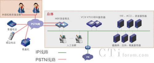 設(shè)備介紹:H3C VCX V7005完成呼叫處理;結(jié)合網(wǎng)音中間件軟件完成自動(dòng)語音應(yīng)答、人工智能排隊(duì)、錄音、話務(wù)統(tǒng)計(jì)輸出等功能;MSR語音網(wǎng)關(guān)完成PSTN落地功能。
