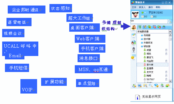 UcSTAR:Unified Communication Star,是擎旗技術(shù)研發(fā)的統(tǒng)一通訊平臺,它為企業(yè)提供多種通訊手段(企業(yè)即時通信、視頻、語音、郵件、短信、電話、MSN/QQ互通等),并可融合企業(yè)的各種應用系統(tǒng)(OA、ERP、CRM、網(wǎng)站、電子商務系統(tǒng)等);將企業(yè)對外溝通、銷售和服務、對內(nèi)溝通和協(xié)作無縫整合;輕松實現(xiàn)無地域/時間限制的,可管理、可控制、可擴展的,集內(nèi)外部溝通、服務和銷售一體化的統(tǒng)一工作平臺。此外,它也可被分離應用為企業(yè)IM及實時協(xié)作系統(tǒng)、多媒體呼叫中心系統(tǒng)、專業(yè)級的IP視頻會議系統(tǒng)等。