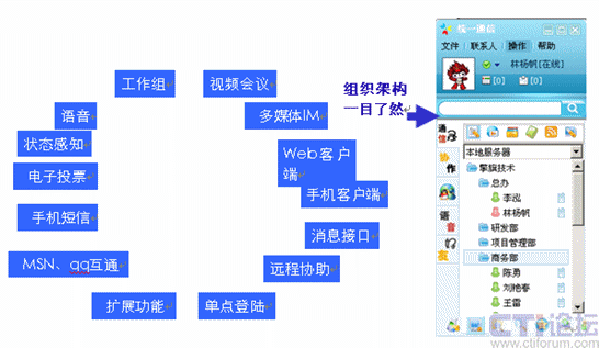 UcSTAR:Unified Communication Star,是擎旗技術(shù)自主研發(fā)的企業(yè)級(jí)融合通信平臺(tái),幫助企業(yè)提高動(dòng)作效率、降低溝通成本、拓展商業(yè)機(jī)會(huì),是一種高度可管理、低成本、易部署的IT工作平臺(tái)。UcSTAR集成了豐富的溝通方式,包括文本會(huì)話、語(yǔ)音/視頻門(mén)外漢、手機(jī)短信、文件傳輸、IP電話、網(wǎng)絡(luò)會(huì)議、應(yīng)用程序共享、企業(yè)管理系統(tǒng)融合,用戶數(shù)據(jù)同步、單點(diǎn)登錄等等。該平臺(tái)定位于降低企業(yè)通信費(fèi)用,增強(qiáng)企業(yè)內(nèi)部溝通能力,改善企業(yè)與客戶之間的溝通渠道,創(chuàng)造新興企業(yè)溝通文化,提高企業(yè)生產(chǎn)力。