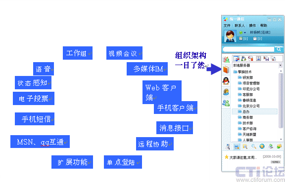 - 工作組:支持同時5000或者更多的人在一個群組即時溝通,文件,IM,圖片支持。