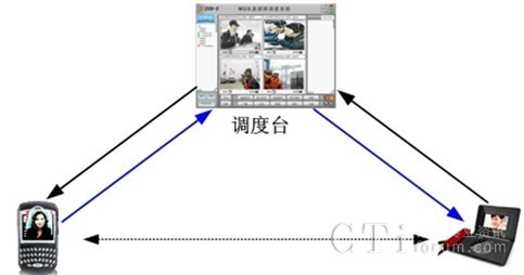 當指揮人員需要讓兩個視頻設(shè)備實現(xiàn)點對點視頻通信時,如兩個終端是同一型號設(shè)備,可直接進行視頻通信,如兩個不同型號的視頻設(shè)備需要進行視頻通信,可由調(diào)度臺調(diào)度兩個視頻設(shè)備,然后通過視頻轉(zhuǎn)發(fā)功能實現(xiàn)兩個不同視頻設(shè)備的視頻通信。