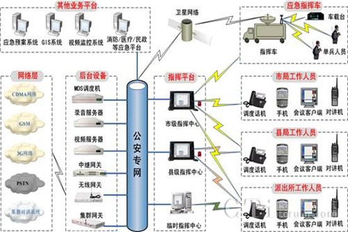 系統(tǒng)基于公安專網(wǎng)部署,融合衛(wèi)星網(wǎng)絡(luò)、PSTN、GSM/CDMA、集群對講網(wǎng)絡(luò)等各種網(wǎng)絡(luò),采用專業(yè)的多媒體調(diào)度平臺實現(xiàn)省、市、縣各級公安機關(guān)之間的互聯(lián)互通和多級指揮調(diào)度,實現(xiàn)語音、視頻、數(shù)據(jù)的同步傳輸和統(tǒng)一調(diào)度。并能和公安部門現(xiàn)有各種業(yè)務(wù)系統(tǒng),如視頻監(jiān)控系統(tǒng)、接處警系統(tǒng)、GIS系統(tǒng)、應(yīng)急預案系統(tǒng)、數(shù)據(jù)庫系統(tǒng)等集成,實現(xiàn)多系統(tǒng)相互調(diào)用,協(xié)同工作。